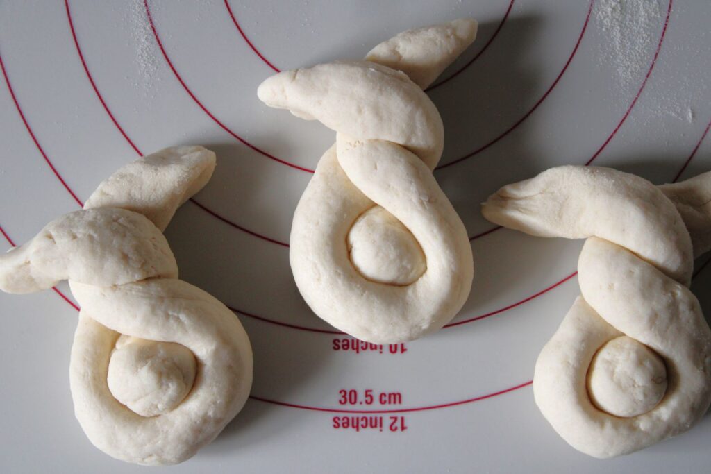 5. Die restlichen Teigstücke nun zu ca. 30 cm langen Strängen formen, die an den Enden dünner werden, die Teigstränge nun jeweils als „U“ um eine Teigkugel legen und ineinander verdrehen, so dass ein Hase mit Schwänzchen und Ohren entsteht.